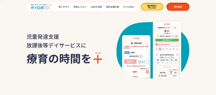 クラウドで療育情報を移行支援に役立てる「デイロボ」は、放課後等デイサービスの業務をデジタル化してスタッフの紙の記録などによる毎日の業務負担を軽減するとともに、子供たちに向き合う療育の時間を増やすためのWebサービスです。日常業務も保護者の方との連絡も、スマホのかんたん操作で業務がもっとらくになります。